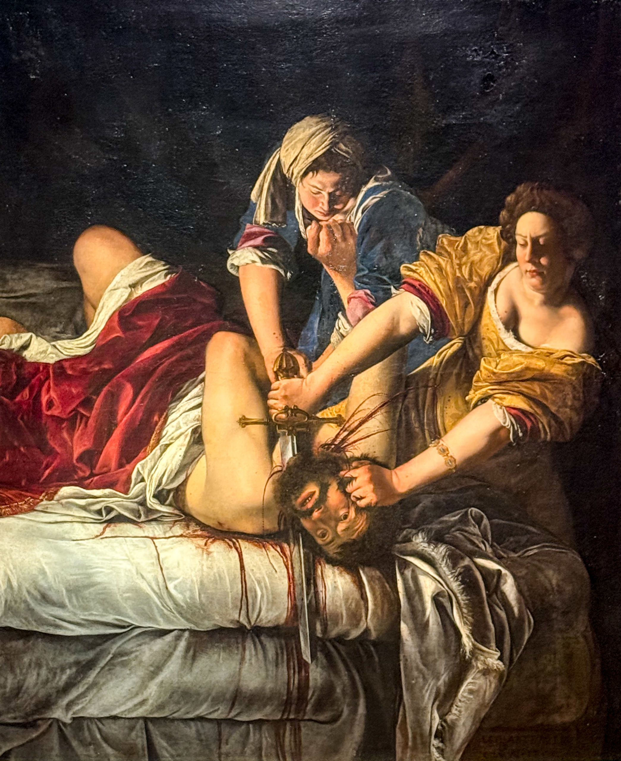 Artemisia Gentileschi (1793-1653), jung vergewaltigt von ihrem ersten Lehrer Agostino Tassi (1778-1644), übertrifft alles an Drastik, sogar Caravaggio. Judiths Magd hält mit aller Kraft die Arme von Holofernes, sodass er sich nicht wehren kann.