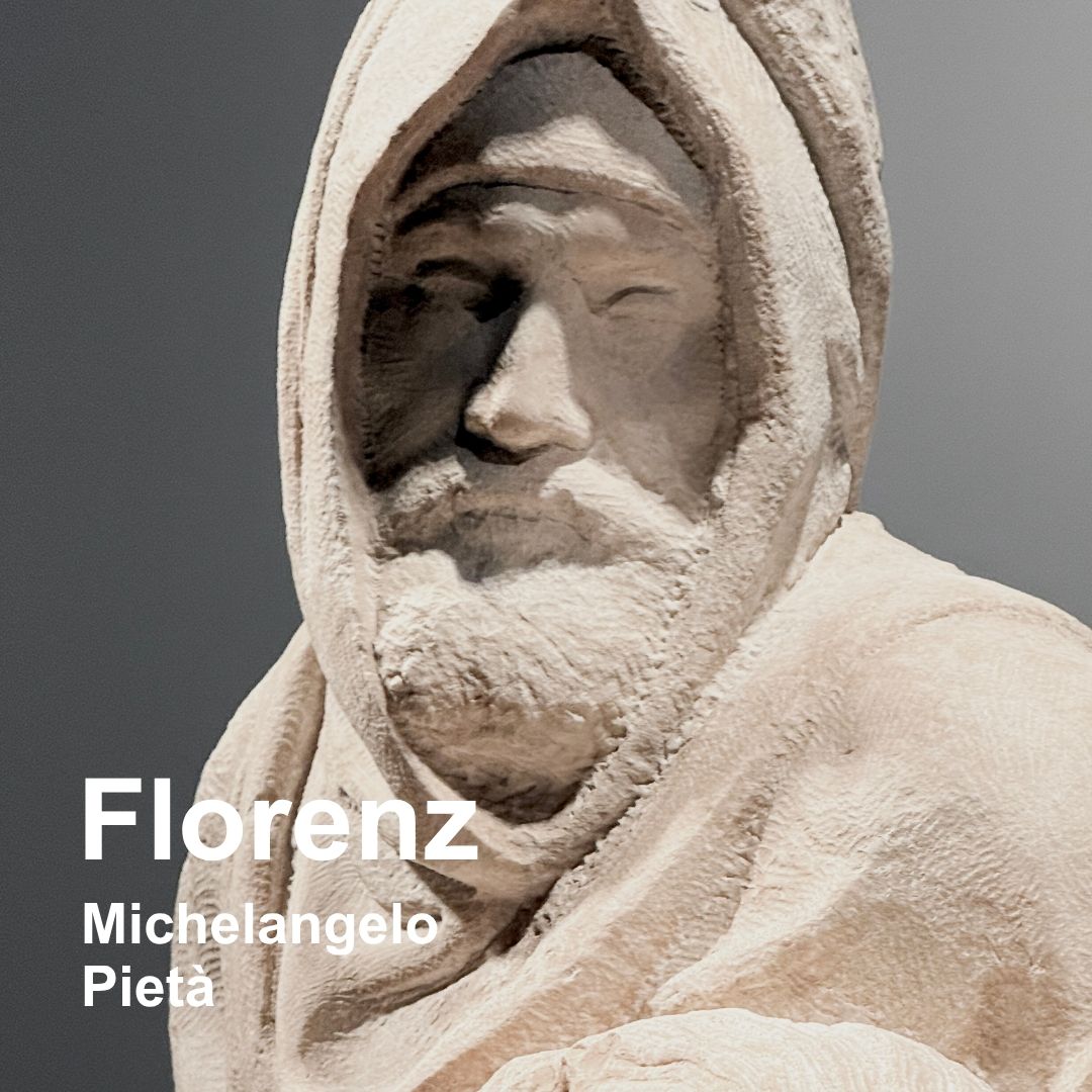 Florenz, Michelangelo, Pietà: die Gruppe gipfelt im Haupt des Nikodemus, dessen Züge als Selbstbildnis des alten Künstlers gelten. Von ihm in seinen 70ern für sein Grabmal vorgesehen, misslingt Michelangelo einiges und er zerstört Teile davon. Seinem entsetzten Diener und Gehilfen Antonio da Casteldurante schenkt er die beschädigte Skulptur. Später erwirbt sie der Bankier Francesco Bandini, weshalb sie auch unter dessen Namen bekannt ist. Michelangelos junger Assistent Tiberio Calcagni (1532-1565) setzt das Werk wieder instand.