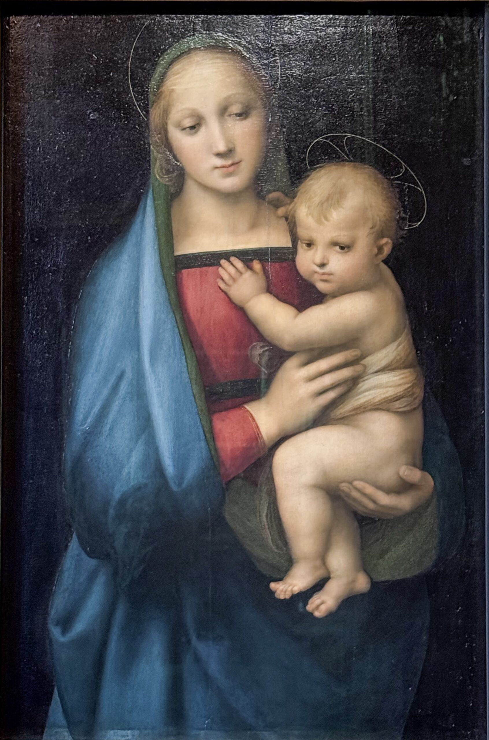 Raffaels große Karriere startet mit einer Reihe florentinIscher Madonnenbilder. Hier tritt Maria, nachdenklich nach unten blickend, als Dreiviertelfigur aus dem Dunkel. Leonardos Einfluss ist zu spüren. Leicht hält sie in natürlicher Weise ihr Kind, das den Betrachter aufmerksam ansieht.