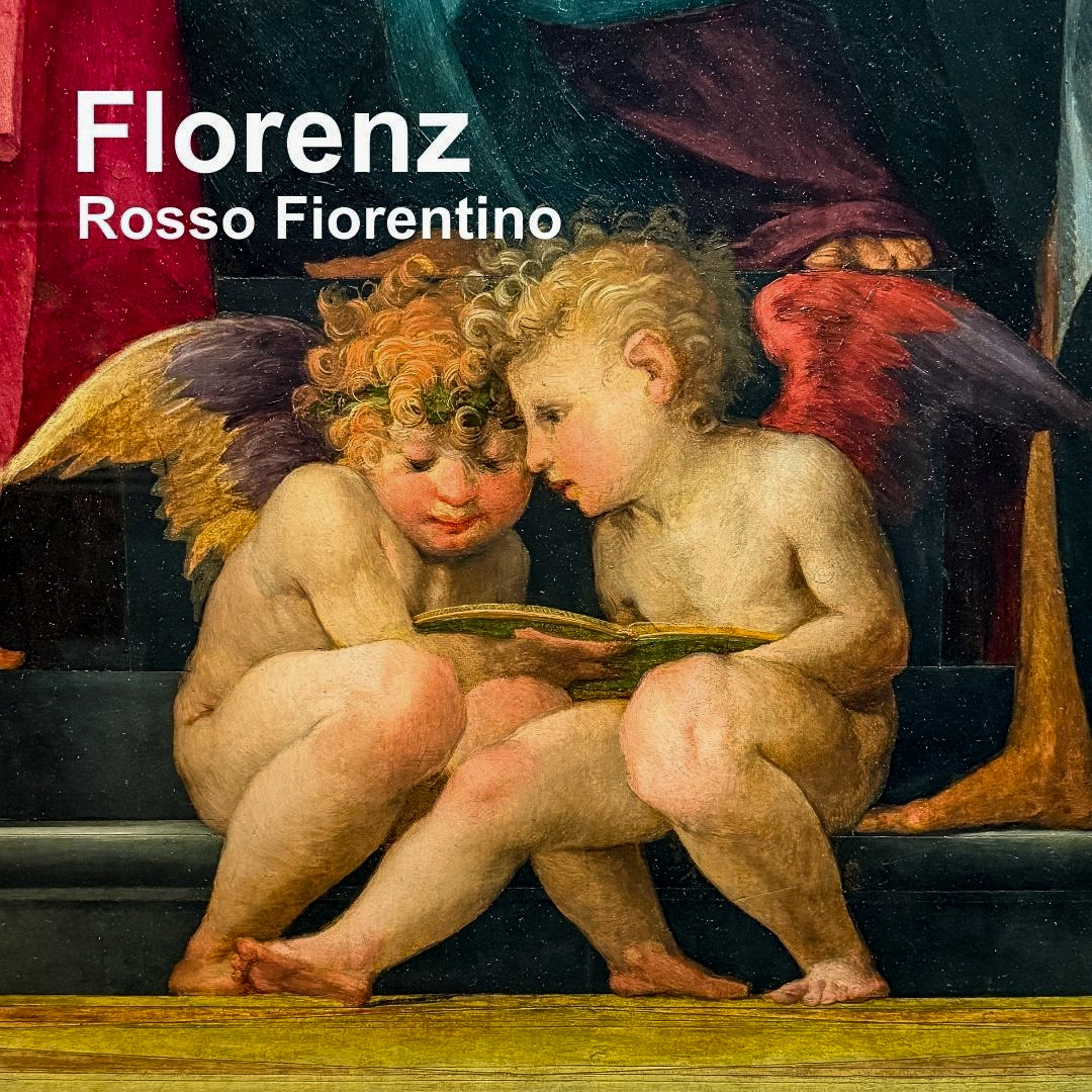 Florenz, Rosso Fiorentino: Detail der Madonna dello Spedalingo. Das hinreißende Engelspärchen beim Nachhilfeunterricht im Lesen oder Singen entstammt einem Skandalbild des jungen Künstlers.