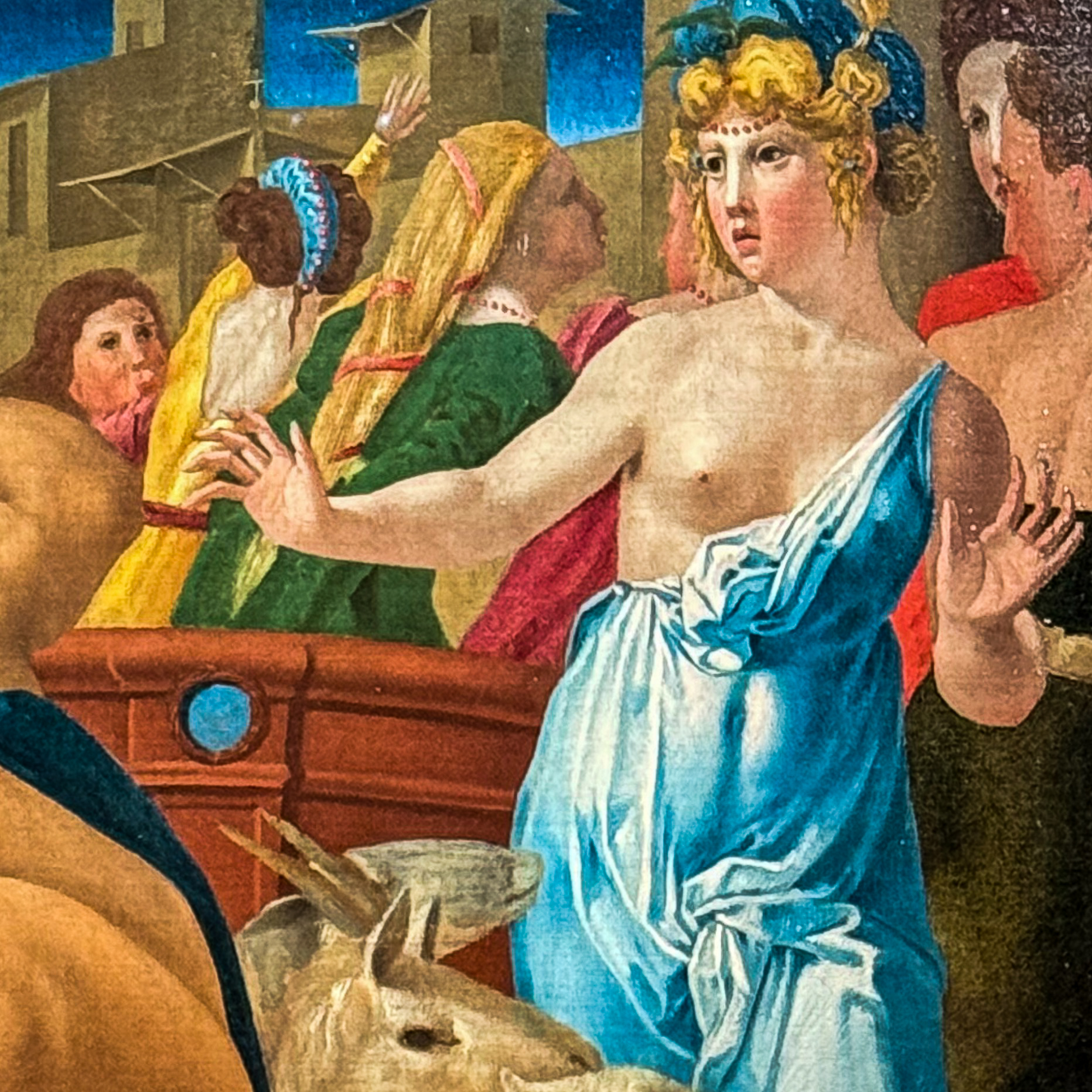 1523, vor gut 500 Jahren gemalt: erschreckte junge Frauen – gewalttätige Männer, Detail des vorigen. Die hier gezeigte älteste Tochter Zippora gibt Jethro Moses zur Frau.
