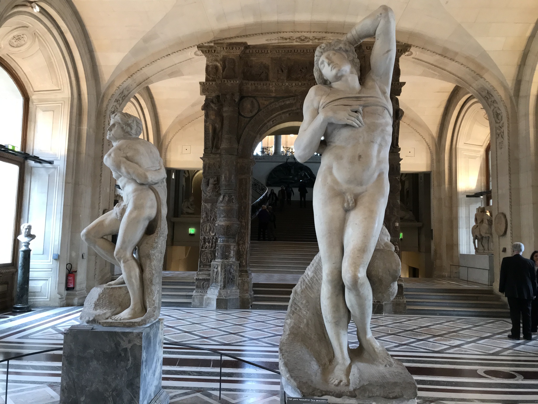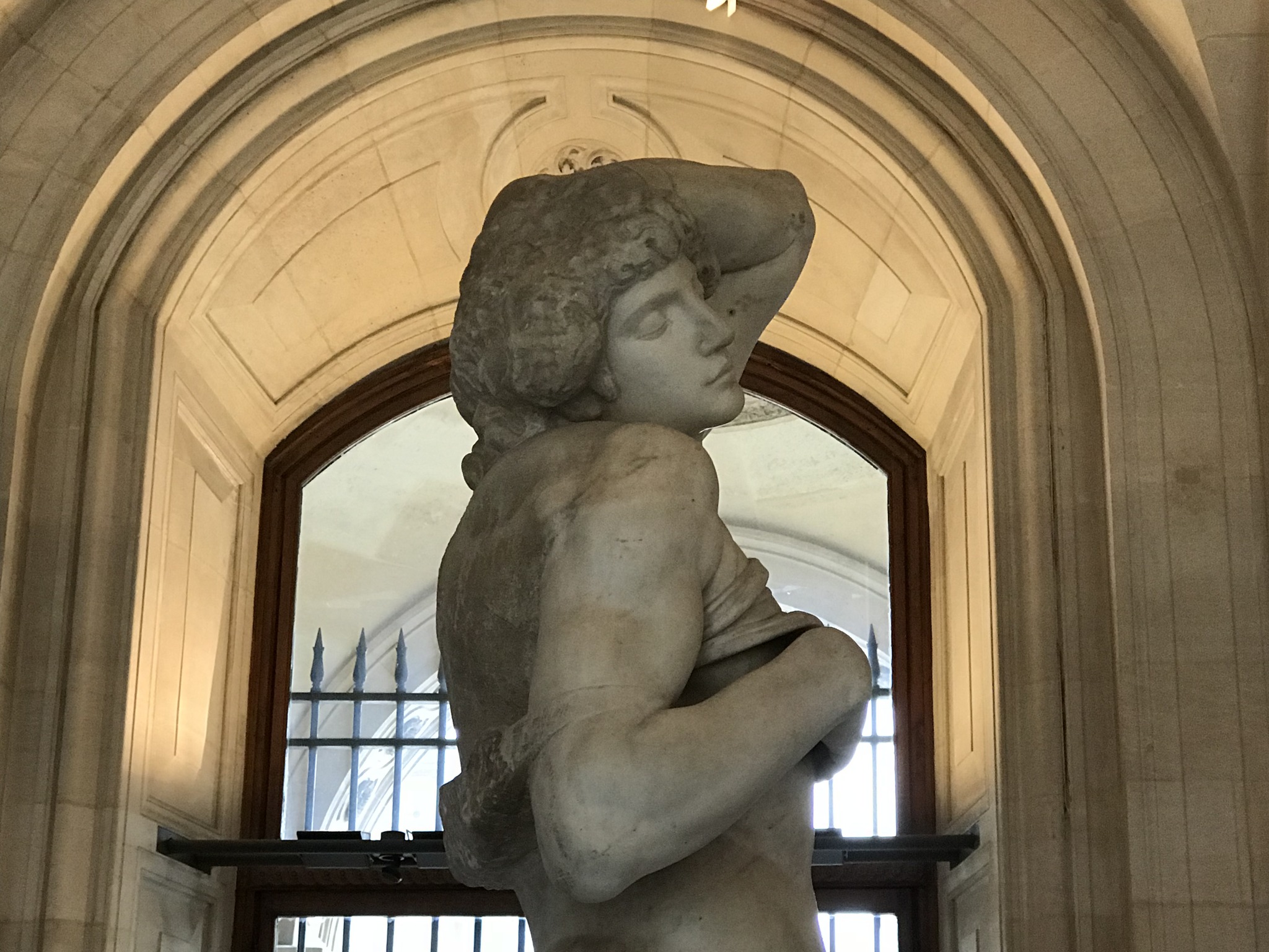 Kaum zu zählen sind die Stunden, die ich in meinem Leben vor Werken Michelangelos verbracht habe. Zu diesen Begegnungen gehören auch stets in Paris seine beiden Sklaven im Louvre. Besonders derjenige, der in absoluter Schönheit stirbt. Ausgeführt in Marmor, 229 cm hoch, unvollendet wie so vieles, das Michelangelo nicht zum Abschluss bringen konnte oder durfte. Nicht nur ich bin von der Gestalt und ihrem Gesichtsausdruck hingerissen.