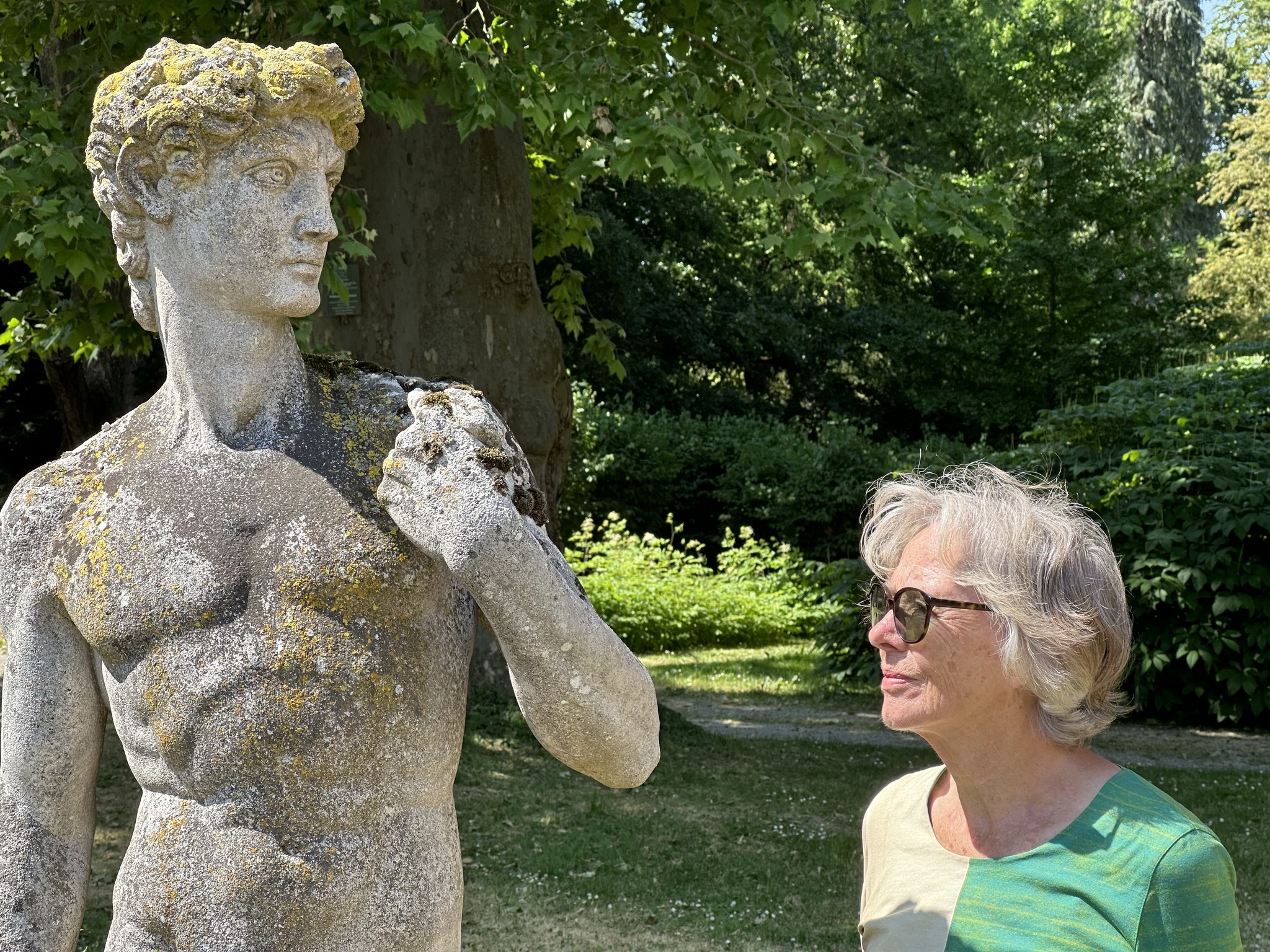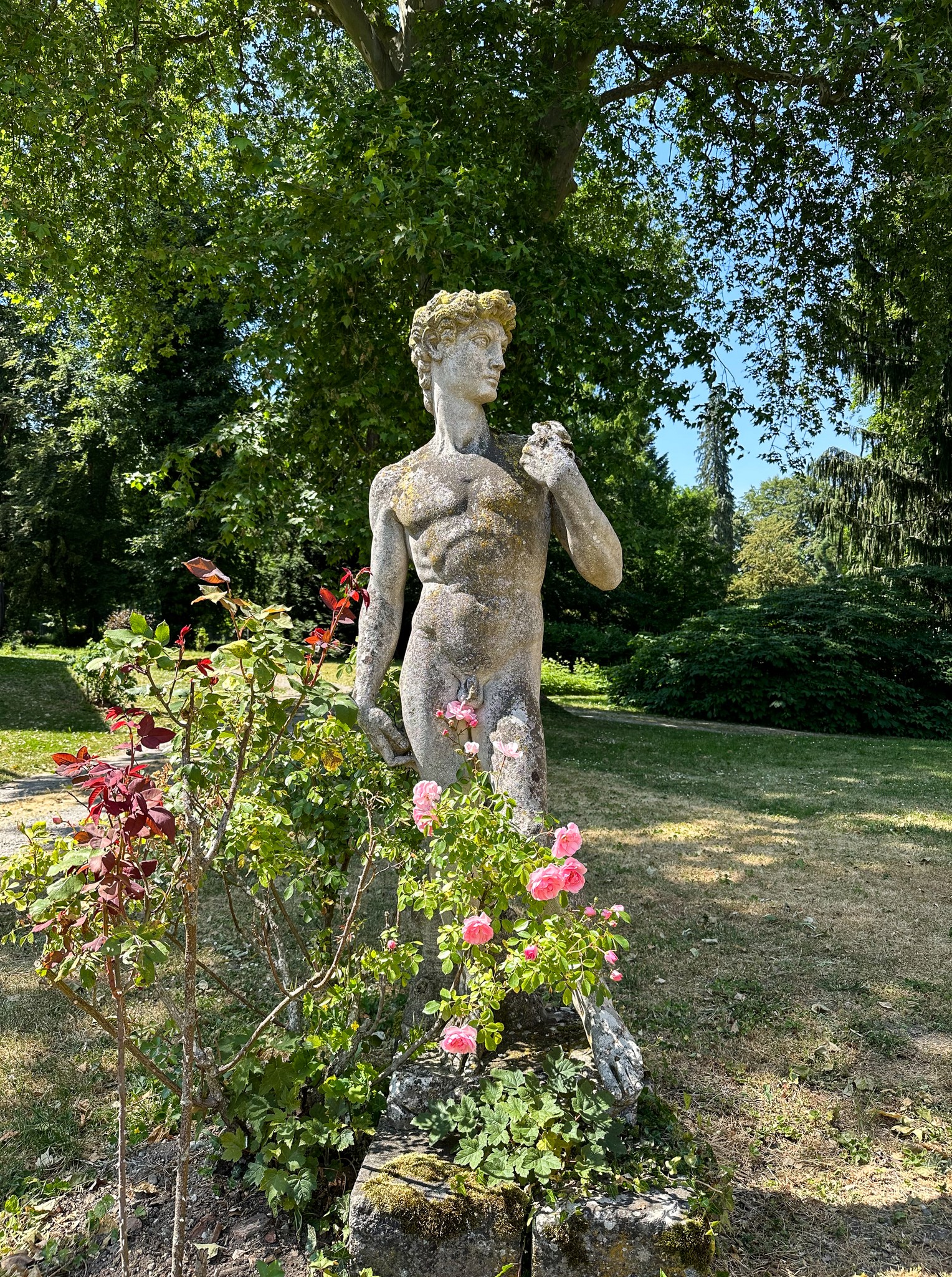 Michelangelos kolossaler David ist im 18. Jahrhundert geschrumpft zu einer Gartenskulptur im Park von Schloss Warthausen bei Biberach. Nicht gesucht, sondern mit Überraschung gefunden und fotografiert im Juni 2023. Fast sieht es so aus, als bedecke anstelle eines Feigenblatts bald eine zarte Rosenblüte die Blöße des jugendlichen Helden.