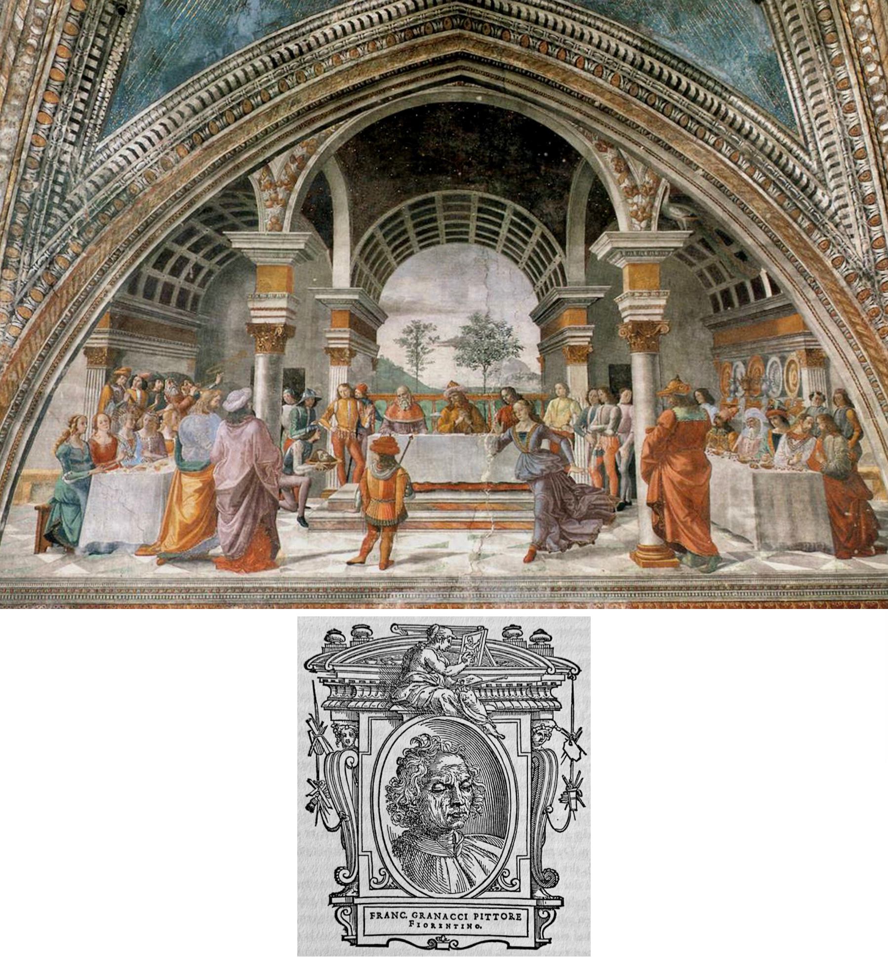 Vermutlich porträtieren sich die Werkstattgehilfen wechselseitig weit oben in der Kapelle. Namen lassen sich bisher mit den 13 hinter den Gästen stehenden Jugendlichen nicht in Verbindung bringen. Abgesehen von einer Ausnahme. Der zweite junge Mann von rechts mit breiter Stirn und verfrühten Geheimratsecken ist Francesco Granacci mit rund 20 Jahren. Man kennt ihn gealtert aus Giorgio Vasaris Künstlerbiographie von 1568. Foto des Freskos Wikimedia.