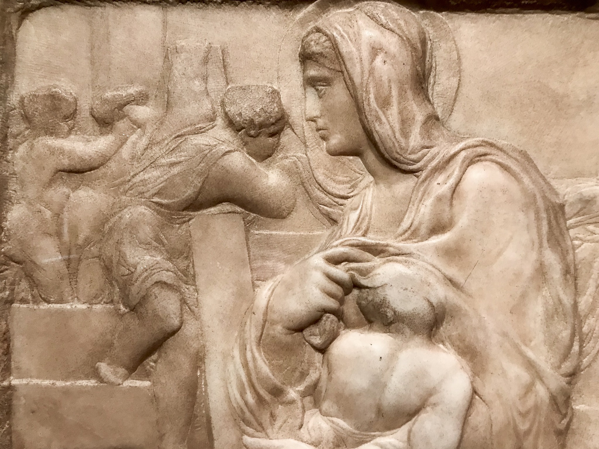 Michelangelo bei Biberach und anderswo: hier in der Casa Buonarroti in Florenz. Als Kostprobe von Michelangelos Genialität in jungen Jahren zeige ich ein Detail seiner wohl frühesten Arbeit in Marmor, 56,7 x 40,1 cm, datierbar um 1490. Die „Madonna an der Treppe“ ist absolut ungewöhnlich in der Deutung und großartig in der Ausführung. Michelangelos spätere Eigenart ist für Nachgeborene bereits zu ahnen. Es ist verständlich, dass die Zeitgenossen sprachlos waren bei dieser Behandlung des Marmors und rätselhaften Auslegung des Themas.