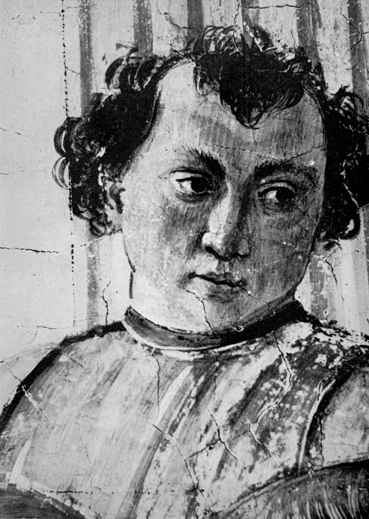 So sieht Francesco Granacci um 1490 als Mitarbeiter der Ghirlandaio-Werkstatt aus: gemalt wohl von einem Mitschüler hoch oben in der Hauptkapelle von Santa Maria Novella beim „Gastmahl des Herodes“. Erkennbar von unten sind solche Porträts damals ohne Lampen und Ferngläser nicht.