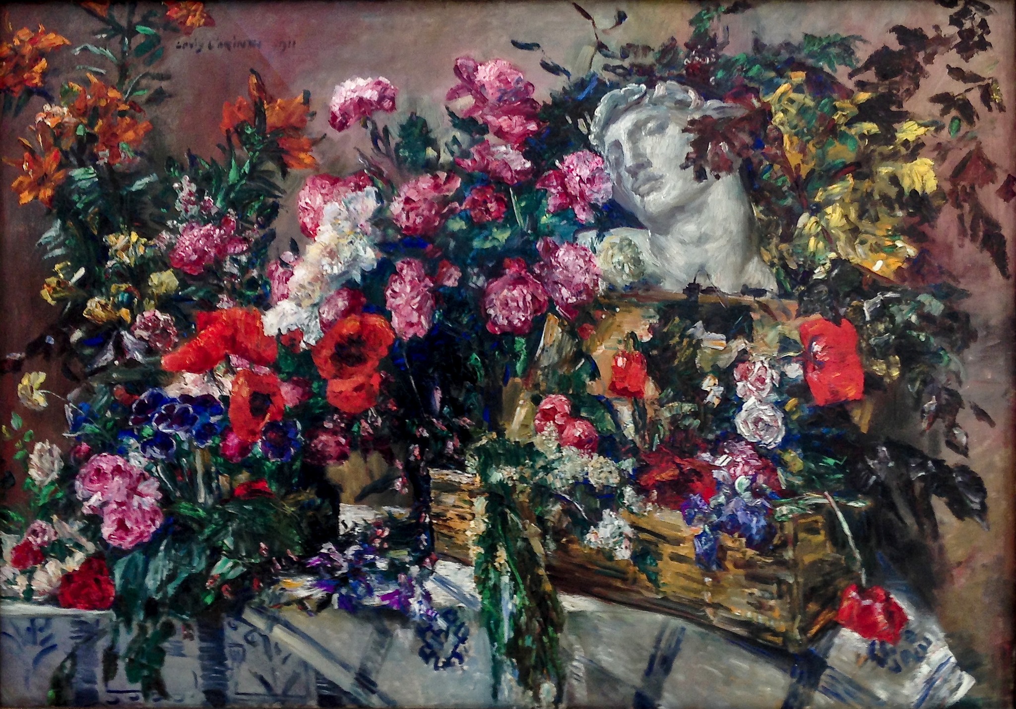 Jedesmal freue ich mich, wenn ich im Lenbachhaus in München dieses große Gemälde, einen „Hymnus an Michelangelo“ von Lovis Corinth (1858-1925), sehe: Öl auf Leinwand, sign. und 1911 datiert, 141 x 201 cm. Ein Blumenfest, um die Züge eines sterbenden jungen Mannes einzufassen und zu feiern. Männliche Schönheit und Melancholie angesichts ihrer Vergänglichkeit. Gemalt zum 31. Geburtstag seiner Frau, der Malerin Charlotte Berend-Corinth.