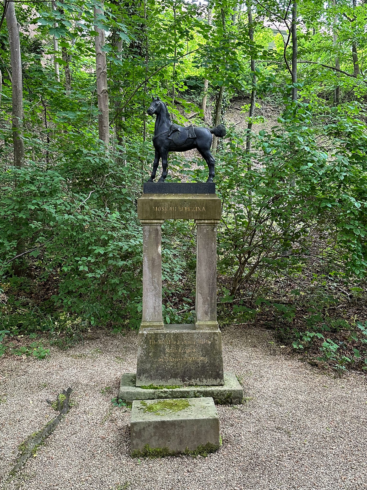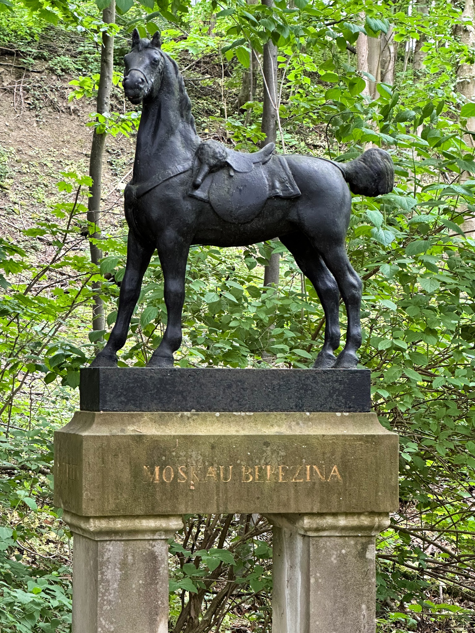Was für eine Überraschung war die Entdeckung des Denkmals im Halbschatten von Laubbäumen. Kein Denkmal für einen einzelnen Menschen, noch für einen Reiter mit seinem Pferd, sondern lediglich für ein gesatteltes Pferd! Der Besitzer und sein Rappe haben miteinander schlimmste Ereignisse überstanden, in wechselseitiger Freundschaft und Treue. Es ist wohl einmalig, dass jemand in dankbarer Erinnerung seinem gesattelten Pferd ein Monument, wenn auch ein schlichtes, errichten lässt.