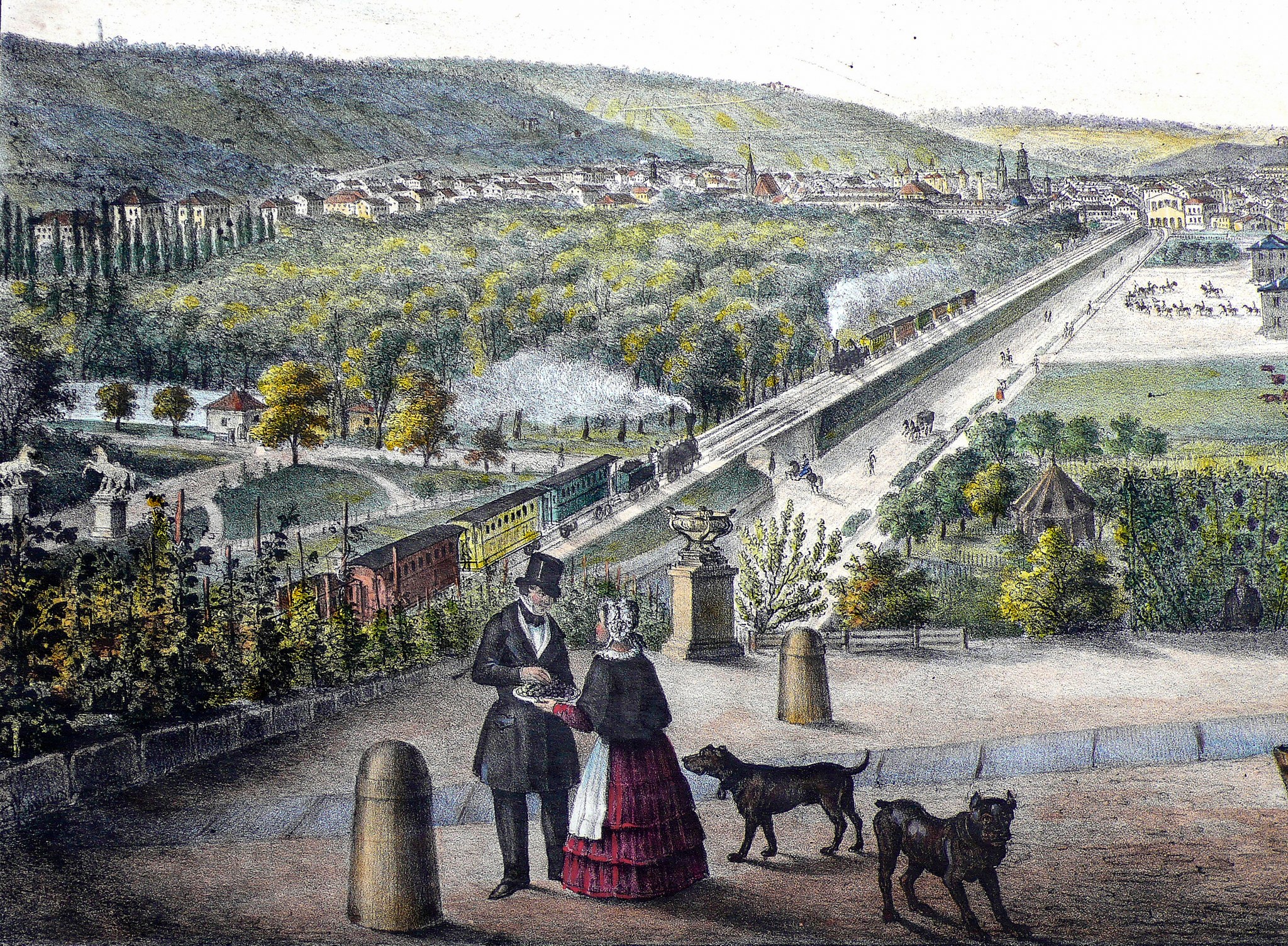 Man hat eine schöne Sicht auf das Stuttgarter Tal, dessen Hänge noch alle unbebaut sind. Viel hat sich seit der Panoramasicht um 1830 getan. Zwei Züge verkehren auf der Bahntrasse nach Cannstatt. Daneben verläuft die Ludwigsburger Straße. Im Mittelgrund die Reiterkaserne und rechts ein Zug in Richtung Feuerbach und Ludwigsburg.