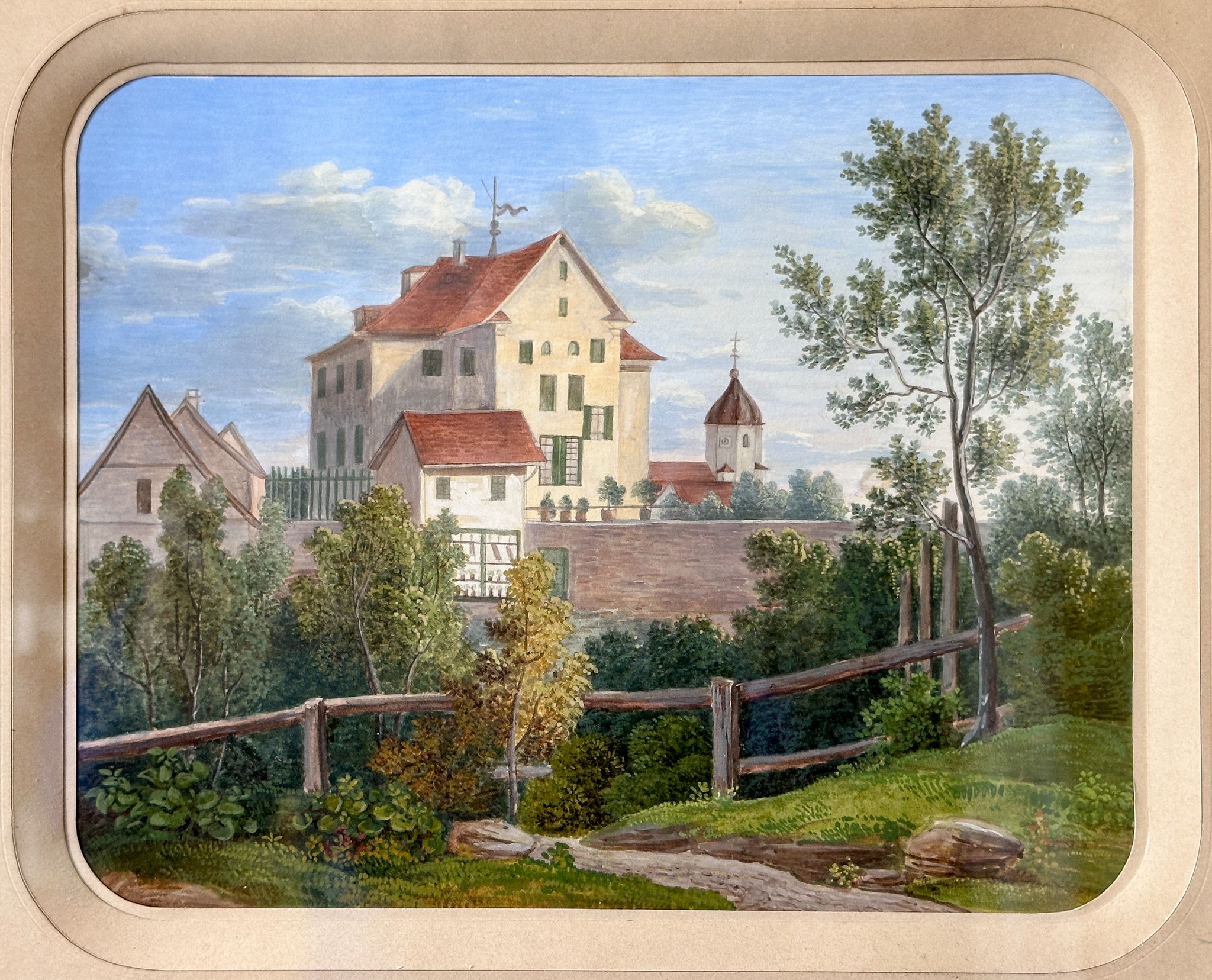 Schloss Fachsenfeld XIV – talentierte Koenigs I, die erste Generation: Elise von Koenig, Schloss Fachsenfeld vor dem Umbau durch ihren Bruder Wilhelm von Koenig, wohl 1833/35, Aquarell, 18,1 x 23 cm, Aalen-Fachsenfeld, Stiftung Schloss Fachsenfeld