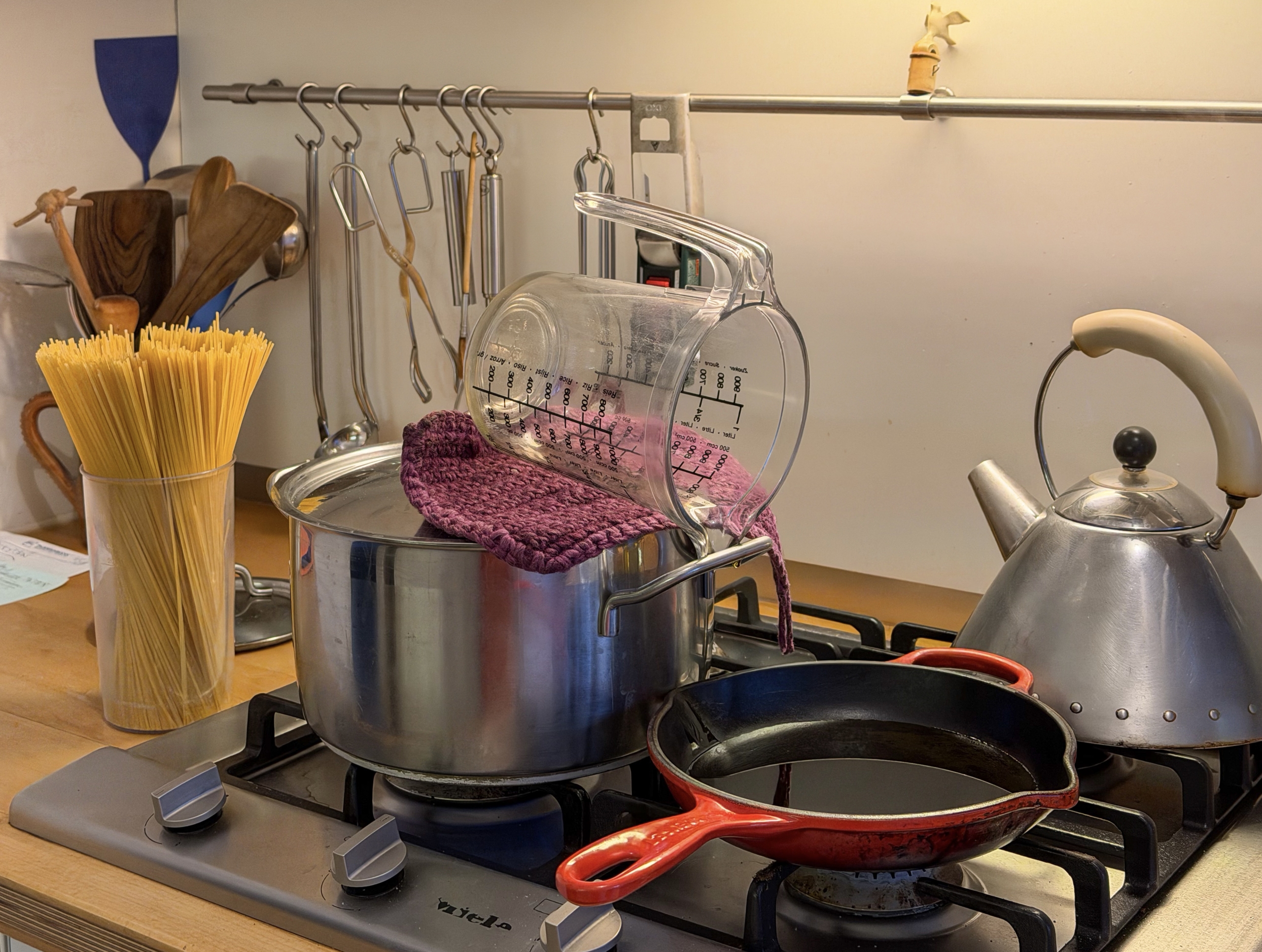 Das führte zu obiger Erfindung und Patent-Anmeldung: auf dem Wassertopf wird der Deckel parallel zu den Seitengriffen gedreht. Ein vom Nachwuchs der 1. oder 2. Generation gehäkelter Topflappen bildet eine ideale stabilisierende Unterlage. Der Messbecher wird so installiert, dass die Tropfen in Ruhe genüsslich in den Schnabel der Pfanne träufeln. Darin werden dann gepresster Knoblauch und klein geschnittene Streifen von Peperoncini kurz und stark erhitzt. Aber keinesfalls angeröstet oder gar gebraten (weil dann ihre Schärfe verloren ginge).