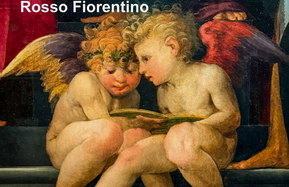 Florenz, Rosso Fiorentino: Detail der Madonna dello Spedalingo. Das hinreißende Engelspärchen beim Nachhilfeunterricht im Lesen oder Singen entstammt einem Skandalbild des jungen Künstlers. Detail of the Madonna dello Spedalingo. The enchanting pair of angels taking private lessons in reading or singing is taken from a scandalous painting by the young artist. Ein frühes Skandalbild Rosso … weiterlesen